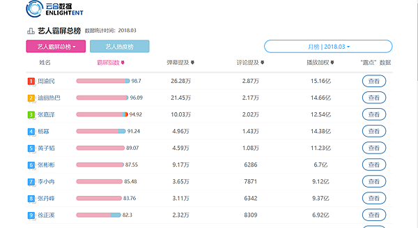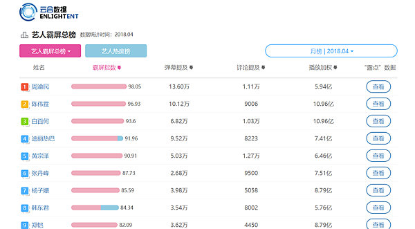 查了一些比較有意思的數據,是霸屏總榜這個數據。